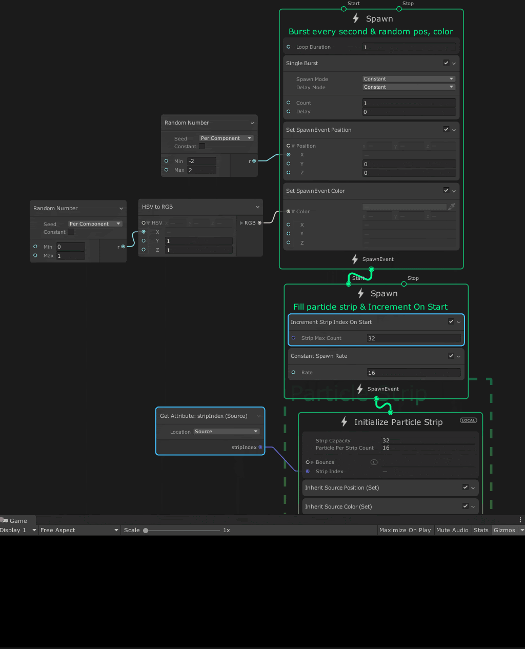 The Increment Strip Index On Start Block helps to manage the initialization of Particle Strips. A Particle Strip comprises of linked groups of particles and the number of these groups is defined by the strip's stripIndex attribute. This Block increments the Particle Strip's stripIndex attribute (unsigned integer) each time the start event of the Spawn Context triggers. This adds a new linked group of particles to the Particle Strip.