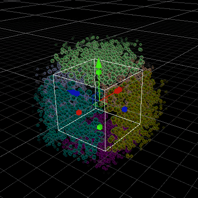 This Block also calculates a direction vector based on the calculated position on the shape, and stores it to the direction attribute, based on composition. This direction is equal to the normal of the face the calculated particle position is on. Selection of the face is made based on six pyramids whose base is each face and whose tip is the box center.