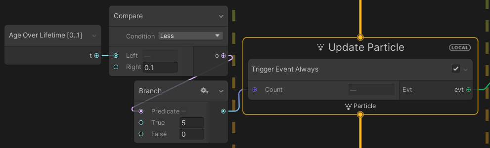 The Trigger Event Always Block triggers the continual creation of a specified number of particles each frame via a GPU Event. Trigger Block always execute at the end of Update, regardless of where the Block is on the blackboard.
