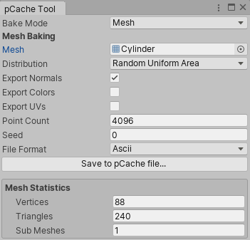 The Point Cache Bake Tool is an Utility Window that enables generating Point Cache Assets from Geometric Data or Textures. It provides basic functionality to scatter points and get attributes from the inputs.
