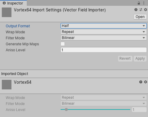 When importing VF Files, unity provides the following settings in the Inspector: