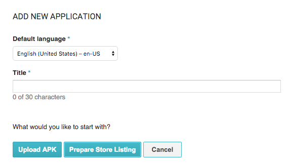 2.为应用程序指定一个 Title(名称)。为了配置应用程序计费,立即选择 “Upload APK”。我们将在稍后步骤中准备和填写商店列表 (Store Listing)。