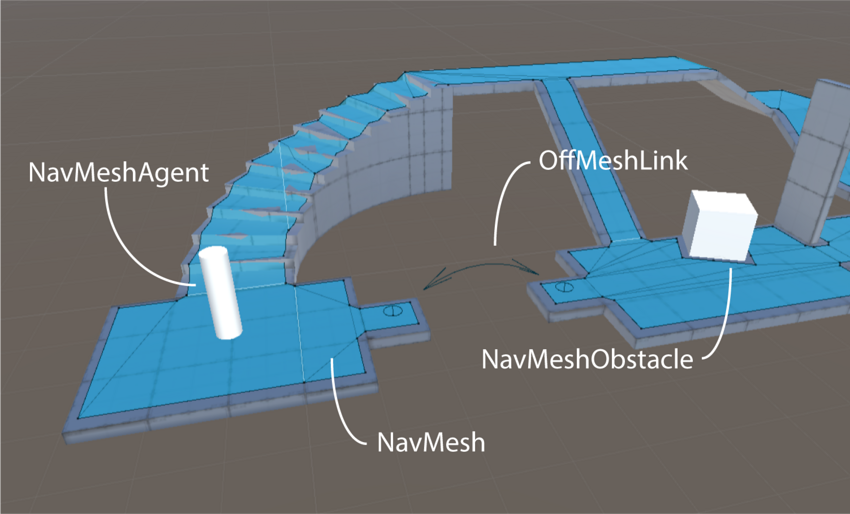 • OffMesh Link component allows you to incorporate navigation shortcuts which cannot be represented using a walkable surface. For example, jumping over a ditch or a fence, or opening a door before walking through it, can be all described as OffMesh links.