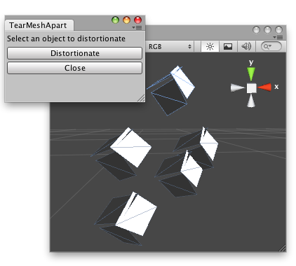 var noiseCounter = 0; var distortionRange = 0.1; @MenuItem("Example/Distortionate Mesh") static function Init() { var window = GetWindow(TearMeshApart); window.position = Rect(0,0,200,80); window.Show(); }