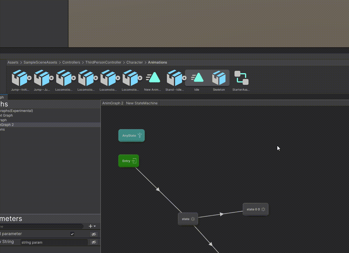 点击新创建的 StateMachine 节点后,将显示下图。其中 Entry 状态和 AnyState 是状态机的初始状态。双击空白区域或单击顶部 AnimGraph 可返回 AnimGraph 进行编辑。