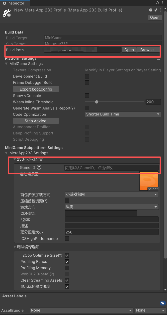 - 随后选中该配置,在右侧的 Build Profile Inspector 中填写小游戏所需的基本信息(如包名、版本号等,详见快速上手),并勾选目标平台为 233 乐园。