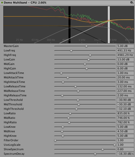 nosotros no vamos a discutir los detalles acerca del procesamiento DSP que se está realizando en los plugins Equalizer (Ecualizador) y Multiband (multi banda) aquí, para aquellos interesado, los filtros son tomados del excelente Audio EQ Cookbook de Robert Bristow Johnson y para colocar las curvas Unity proporciona algunas funciones internas del API para dibujar curvas anti-aliased para la repuesta de frecuencia.