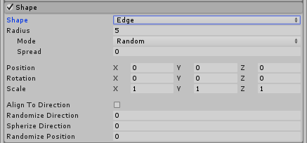 | Mode | Define how particles are generated along the radius of the shape. When set to Random, Unity generates particles randomly along the radius. If using Loop, particles are generated sequentially along the radius of the shape, and loops back to the start at the end of each cycle. Ping-Pong is the same as Loop, except each consecutive loop happens in the opposite direction to the last. Finally, Burst Spread mode distributes particle generation evenly along the radius. This can be used to give you an even spread of particles, compared to the default randomized behavior, where particles may clump together unevenly. Burst Spread is best used with burst emissions. |