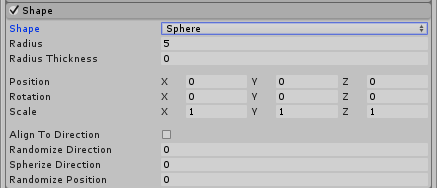 | Spherize Direction | Use a value 0–1, to blend particle directions towards a spherical direction, where they travel outwards from the center of their Transform. When this is set to 0, this setting has no effect. When it is set to 1, the particle direction points outwards from the center (behaving identically to when the Shape is set to Sphere). |