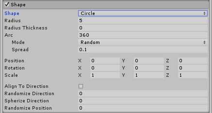 | Radius Thickness | A value of 0 will emit from the outer edge of the circle. A value of 1 will use the entire area. Values in between will use a proportion of the area. |
