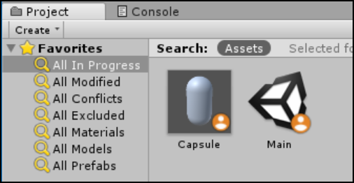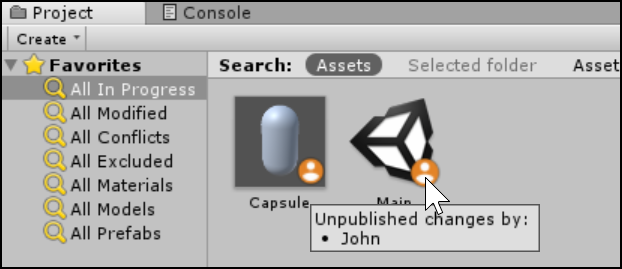 Unity Collaborate monitorea constantemente los cambios que los miembros del equipo hacen en su Proyecto. Cuando un miembro del equipo guarda los cambios en una escena o prefabricada en su equipo local, Collaborate le notifica que el elemento se ha cambiado al mostrar una insignia en progreso en el activo.