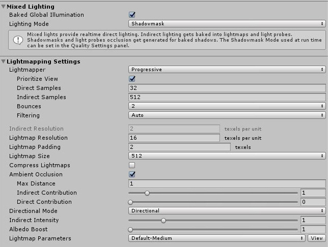| Lighting Mode | Specifies which lighting mode Unity should use for all mixed lights in the Scene. Options are Baked Indirect, Distance Shadowmask, Shadowmask, and Subtractive. | ||||||