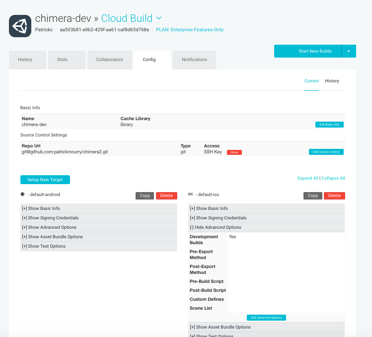 Para acceder a las opciones avanzadas de su objetivo de construcción, vaya al sitio web de Unity Developer. Seleccione su proyecto, ingrese la sección Unity Cloud Build para el proyecto, luego seleccione la pestaña Config, que se muestra a continuación.