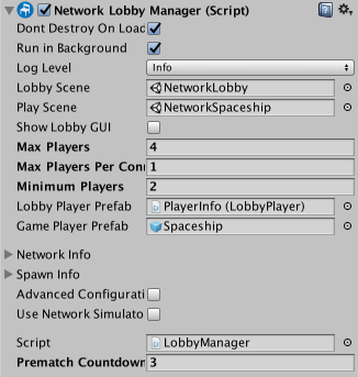 • Add the NetworkLobbyManager component to the LobbyManager GameObject