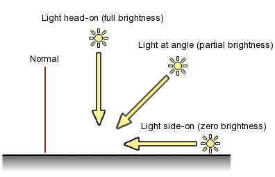 すべてのオブジェクトの基本形状は複数の三角形で決定できますが、ほとんどのケースで、メッシュを表示するのに追加の情報が必要です。オブジェクトがライティングのために正しくシェーディングされるには、各頂点に法線ベクトルが必要です。法線は外に向かって伸びるベクトルで、対応する頂点位置のメッシュの表面から垂直に伸びています。シェーディング計算において、各頂点の法線ベクトルは入射するライトの方向 (これもベクトル) と比較されます。もし 2つのベクトルが完全に平行である場合、面は真上からライトを受け、ライトの輝度はすべてシェーディングに使用されます。法線ベクトルに対して真横から入射する光の場合、面はまったくライトを受けません。一般的に、ライトは法線に対してある程度の角度で入射するため、シェーディングは完全に明るい輝度と真っ暗の間になります。その明るさは角度によって異なります。
