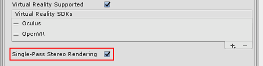 この機能を有効にするには PlayerSettings __ を開きます (Edit > Project Settings > Player)。PlayerSettings__ で Other Settings に移動し、Virtual Reality Supported にチェックを入れ、それからその下の Single-Pass Stereo Rendering にチェックを入れます (2017.3 の新しいバージョンでは、PlayerSettings で XR Settings に移動し、Virtual Reality Supported にチェックを入れ、その下の __Stereo Rendering Mothod __ ドロップダウンで Single Pass を選択します)。