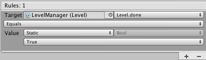 | Rule List | 条件を作成、削除するには、 + や - をクリックします。各条件には以下が含まれます。Target は比較の対象オブジェクトとそのフィールド、Value は静的な値か別のMonoBehaviour オブジェクトのフィールドのいずれか、 演算子 のドロップダウンは比較の種類です。 | |