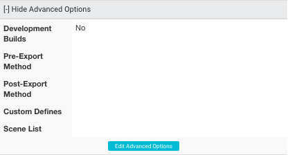 すべての詳細なオプションはビルドターゲットごとに設定されます。例えば、iOS ターゲットの Advanced Options リンクをクリックすると、オプションはその iOS ターゲットだけのオプションです。 Android ターゲットの Advanced Options をクリックすると、そのオプションはその Android ターゲット用です。このように、プラットフォームごと、ビルドターゲットごとに、異なる前処理および後処理メソッドを使用できます。
