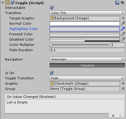 | Toggle Transition | 値が変更されたときのトグルの視覚的な反応の仕方です。オプションは None (例:単純に表示と非表示)と Fade (例:フェードインもしくはフェードアウト)があります。 |