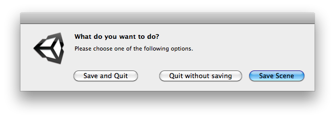 [MenuItem( "Example/Enhanced Save" )] static void Init( ) { int option = EditorUtility.DisplayDialogComplex( "What do you want to do?", "Please choose one of the following options.", "Save Scene", "Save and Quit", "Quit without saving" );