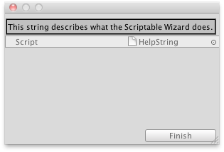 public class HelpString : ScriptableWizard { [MenuItem ("Example/Show Help String")] static void CreateWindow() { ScriptableWizard.DisplayWizard("", typeof(HelpString), "Finish"); } void OnWizardUpdate() { helpString = "This string describes what the Scriptable Wizard does."; } }