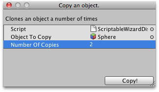 public GameObject objectToCopy = null; public int numberOfCopies = 2; [MenuItem ("Example/Show DisplayWizard usage")] static void CreateWindow() { // Creates the wizard for display ScriptableWizard.DisplayWizard("Copy an object.", typeof(ScriptableWizardDisplayWizard), "Copy!"); } void OnWizardUpdate() { helpString = "Clones an object a number of times"; if(!objectToCopy) { errorString = "Please assign an object"; isValid = false; } else { errorString = ""; isValid = true; } } void OnWizardCreate () { for(int i = 0; i < numberOfCopies; i++) Instantiate(ObjectToCopy, Vector3.zero, Quaternion.identity); } }