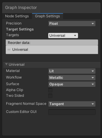 Graph Inspector の Graph Settings (グラフ設定) タブを使用して、Shader Graph 全体に影響する設定を変更します。Graph Settings メニューを開くには、Graph Inspector の Graph Settings タブをクリックします。Graph Inspector が表示されない場合は、Shader Graph のタイトルバー の Graph Inspector ボタンを押してください。