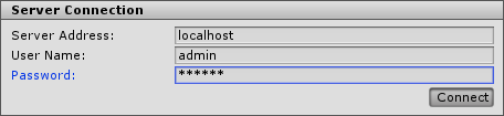 4. Server Address フィールドにて管理したい Asset Server の IP address または host name を入力します。もしローカルマシンに Asset Server がインストールされていれば Server Address に “localhost” を使用できます。次に管理者のユーザー名とパスワードを入力します。管理者のユーザー名はつねに “admin” であり、パスワードは Asset Server をインストールしたときに入力した内容です。最後に Connect ボタンをクリックします。これで Asset Server に接続され、初期設定を実行できます。
