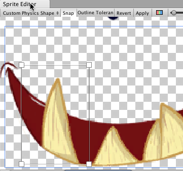 | Outline Tolerance | このスライダーを使って、作成されたアウトラインがスプライトテクスチャのアウトラインにどれだけぴったりと正確に沿うかを制御します。最小値 (0) で、スプライトエディターはスプライトの周囲に基本的なアウトラインを作成します。最大値 (1) では、スプライトエディターはスプライトのアウトラインにできるだけ近いアウトラインを作成します。 |