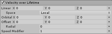 Speed Modifier プロパティは [2017.3] で Velocity over Lifetime モジュールに追加 (https://docs.unity.cn/2017.3/Documentation/Manual/30_search.html?q=newin20173) NewIn20173