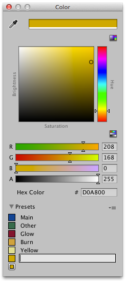 참고: 위의 설명은 스탠다드 Unity 컬러 피커를 보여줍니다. 환경 설정에는 OS X 컬러 피커를 대신 사용할 수 있는 옵션이 있습니다.