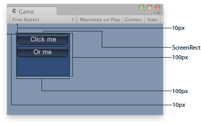 public class ExampleClass : MonoBehaviour { void OnGUI() { using (var areaScope = new GUILayout.AreaScope(new Rect(10, 10, 100, 100))) { GUILayout.Button("Click me"); GUILayout.Button("Or me"); } } }