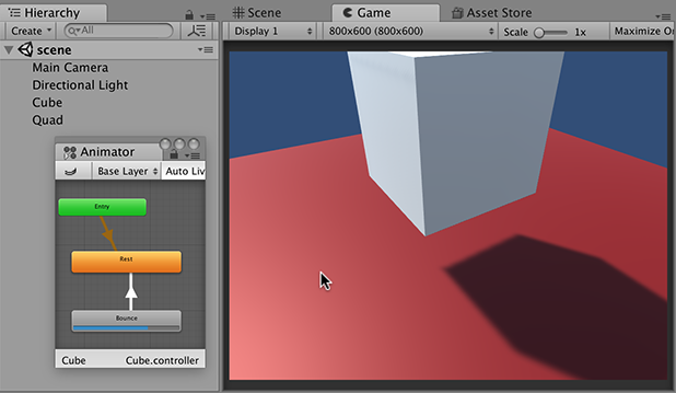 This cube has two Animator states called Rest and Bounce. An empty animation is played in the Rest state. When the Space key is pressed the cube switches into the Bounce state. This causes the cube to jump up and down twice. The cube then returns to the Rest state. Because Bounce is selected from the Animator.Play script, no Transition is needed. However the return from Bounce to Rest does have a Transition. Has Exit Time is ticked to make Bounce last for its one second. Attach this script to the GameObject you want to animate.