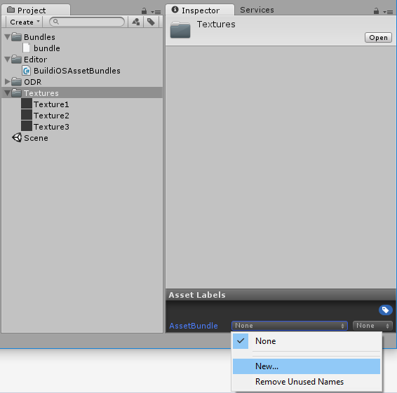 이 예제에서는 Textures 폴더에 textures 라는 레이블이 할당되었습니다. 또한 새로운 스크립트인 BuildiOSAssetBundles.cs 를 Editor 폴더에 생성했습니다.