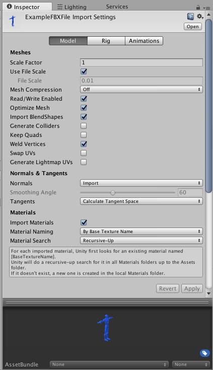 모델 파일의 Import Settings 는 모델을 선택하면 FBX 임포터의 인스펙터 창에서 Model 탭에 표시됩니다. 이것은 Mesh, Normals 및 Materials에 영향을 미칩니다. 설정은 디스크의 에셋별로 적용되므로 설정이 다른 에셋이 필요한 경우 중복 파일을 만들어 이름을 바꿔야 합니다.