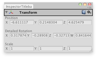 public class InspectorTitlebarExample : EditorWindow { bool fold = true; Vector4 rotationComponents; Transform selectedTransform; $ [MenuItem("Examples/Inspector Titlebar")] static void Init() { var window = GetWindow(typeof(InspectorTitlebarExample)); window.Show(); }