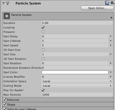 The Particle System's general parameters are kept inside a special Main module. These parameters are visible in the Inspector above all the other modules: