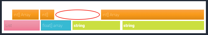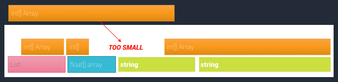 The above diagram shows an example of memory fragmentation. When an object is released, its memory is freed. However, the freed space does not become part of a single large pool of “free memory”. The objects on either side of the freed object may still be in use. Because of this, the freed space is a “gap” between other segments of memory (this gap is indicated by the red circle in the diagram). The newly-freed space can therefore only be used to store data of identical or lesser size than the freed object.