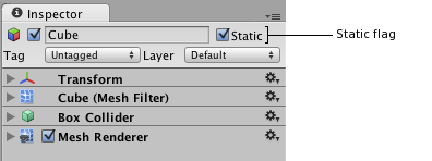 При использовании статичного батчинга вы должны убедиться, что объекты статичны и не двигаются, не вращаются и не масштабируются во время выполнения. Если эти условия соблюдаются, можно пометить объекты как статичные, поставив галочку Static в Inspector: