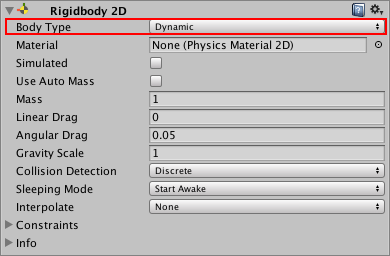 Body Type Set the RigidBody 2D’s component settings, so that you can manipulate movement (position and rotation) behavior and Collider 2D interaction.