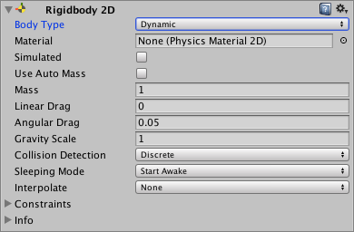 The Rigidbody 2D component. This appears differently in the Unity Editor depending on which Body Type you have selected. See Body Type, below, to learn more.