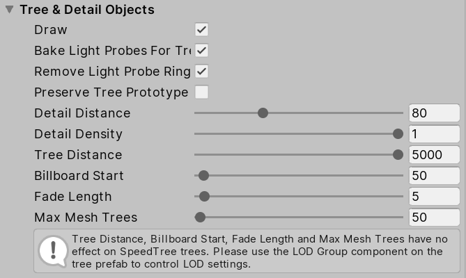 | Preserve Tree Prototype Layers | Check this box if you want your tree instances to take on the layer values of their prototype Prefabs, instead of the Terrain GameObject’s layer values. |